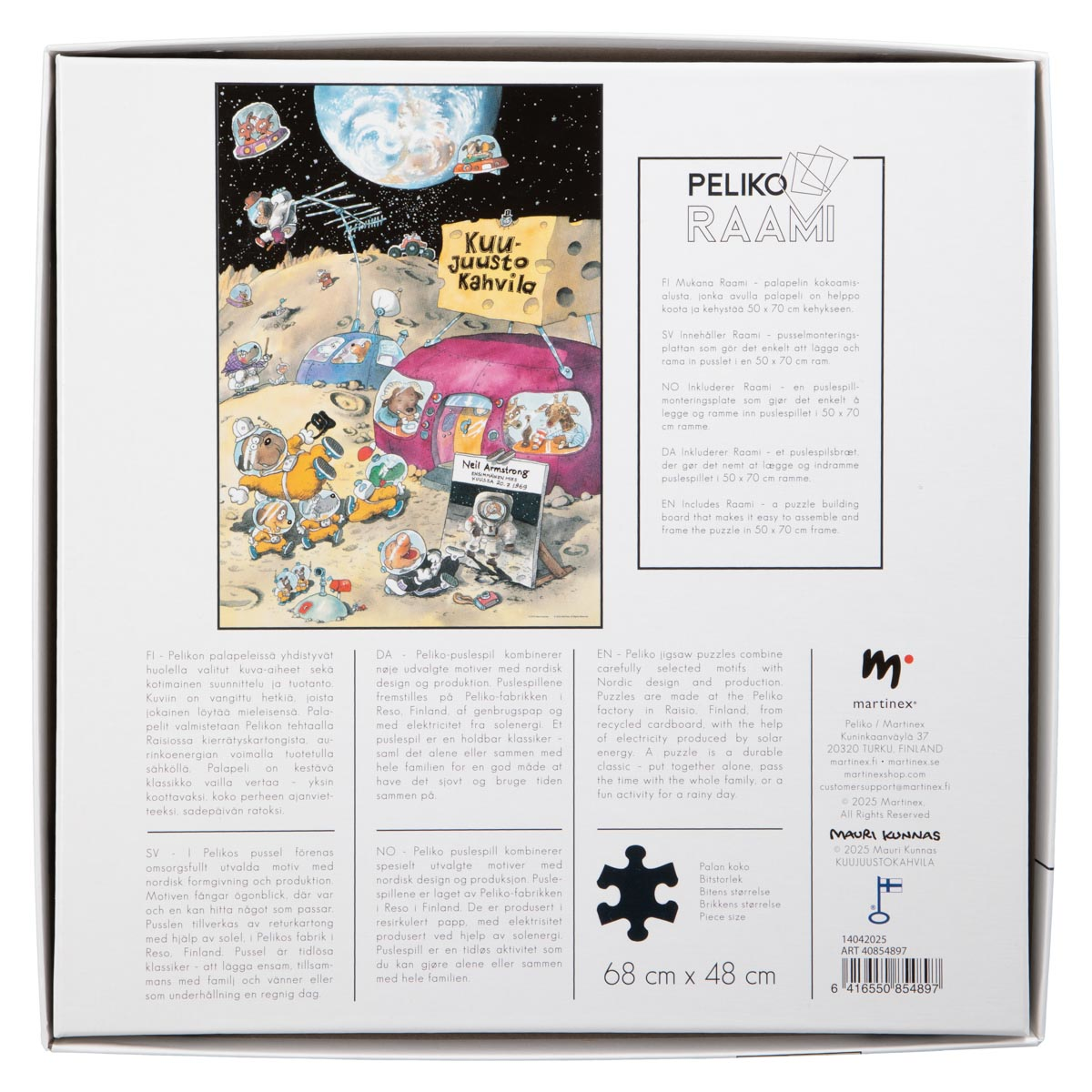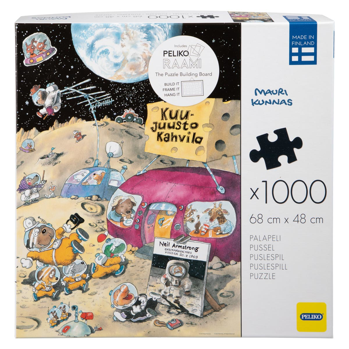 Mauri Kunnaksen piirrosjäljellä varustettu hauska 1000-palainen palapeli, jossa ollaan luokkaretkellä kuussa. Yhden palan suuntaa-antava koko on n. 2 x 2,8 cm, palan muodosta riippuen. Palapeli on valmistettu kierrätyskartongista, ja sen koko on valmiiksi koottuna 68 x 48 cm. Pakkaus sisältää Peliko Raamiin –kokoamisalustan, jonka avulla palapeli on helppo koota ja kehystää mihin tahansa standardikokoiseen 50 x 70 cm kehykseen. Rauhallisiin hetkiin palapelin äärellä, yksin tai hyvässä seurassa. Valmiin palapelin voi halutessaan vaikka kehystää seinälle tai koota myöhemmin uudelleen. Istahda siis hetkeksi palapelin äärelle ja nauti haasteesta sekä muodostuvasta kuvasta!